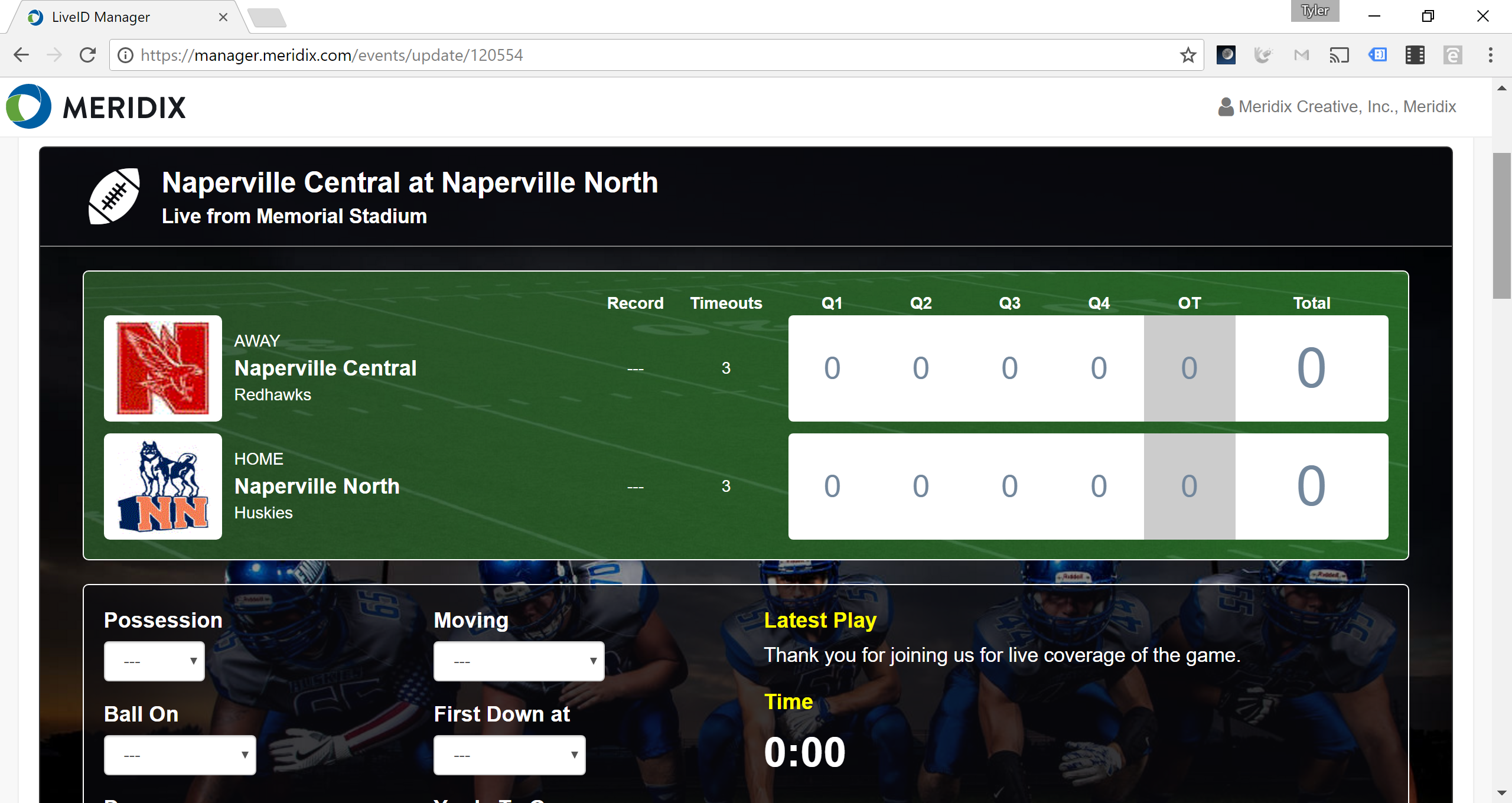 2. You will arrive at the live event management screen, which should say "Live Streaming Is Enabled" at the top. To update information, such as a score, click on an element and it will be surrounded with a green box. Change the data in the box and then click elsewhere to automatically submit.