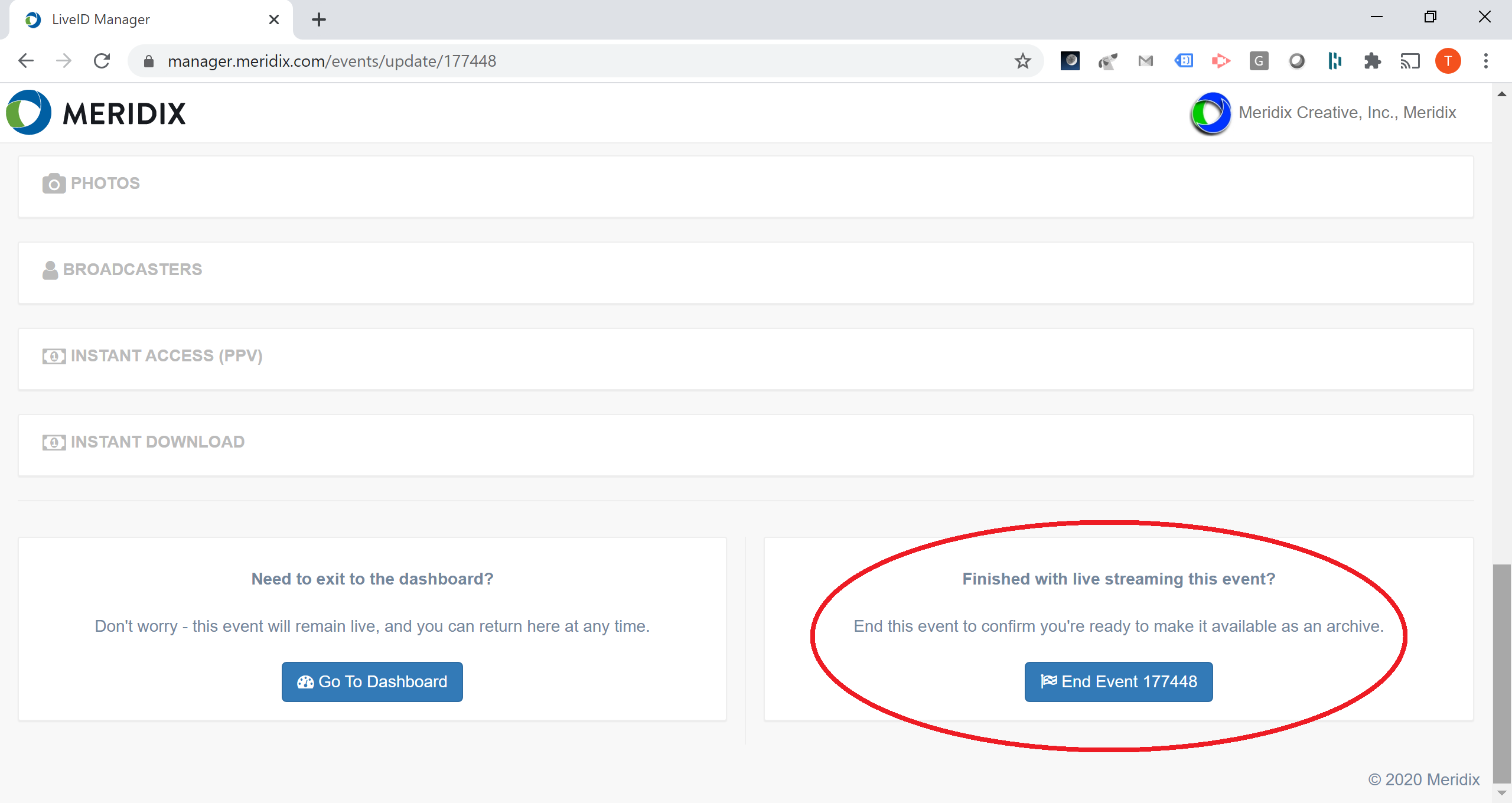2. Once you have confirmed that the live stream is stopped, at the bottom of the live event management screen, click on "End Event". This lets our system know that the event is complete and no further live streaming needs to be paired with this event.