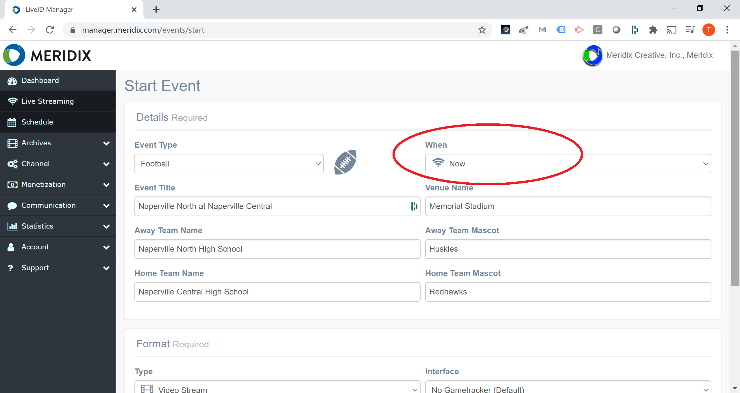 3. You will now be able to add the details for your live event. You will notice that the "Now" option has been selected for you and there are no date or time fields, because the event will go to live status as soon as you complete this screen.