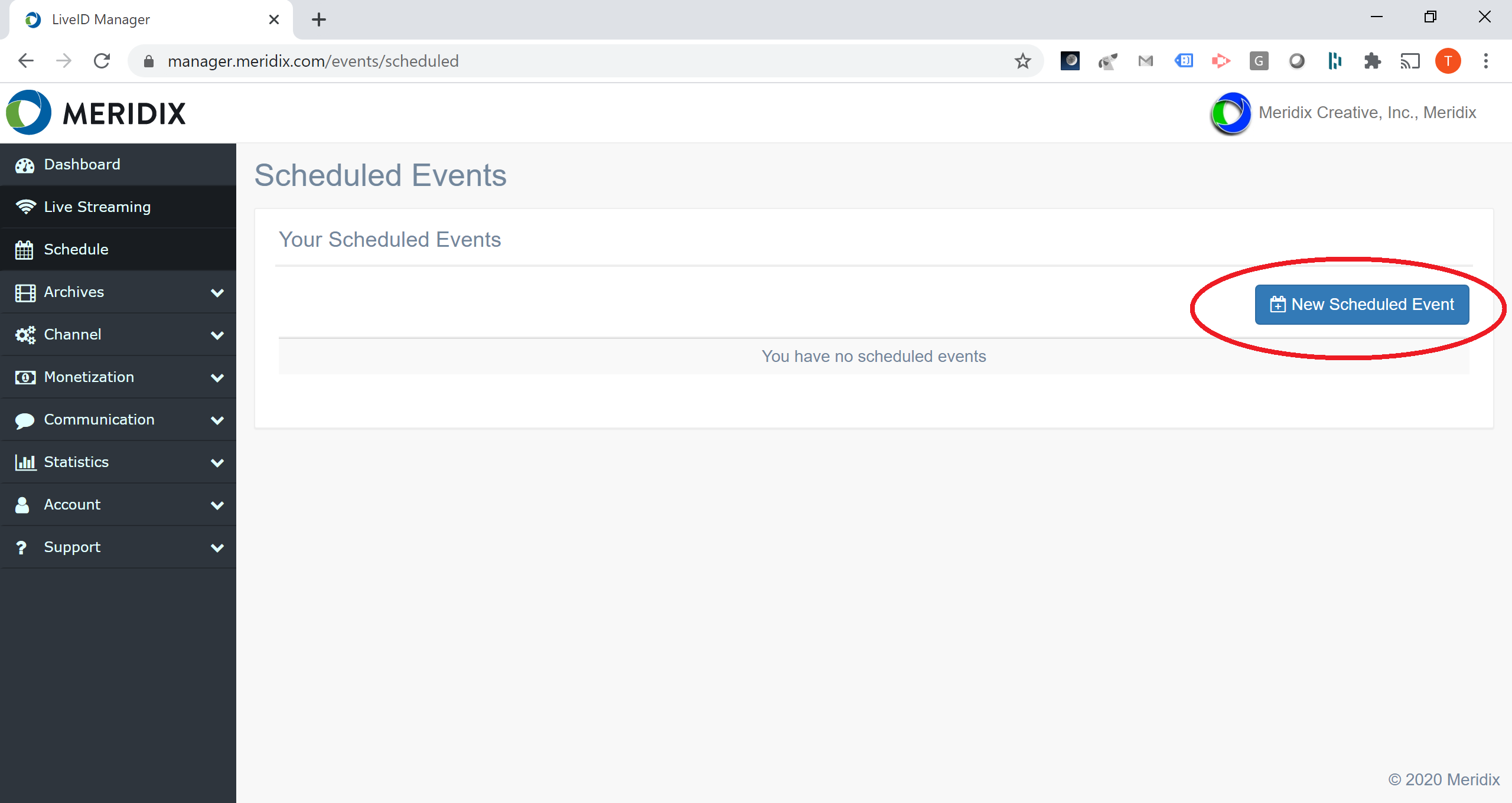 3. Click on the "New Scheduled Event" button. (If you have previously created scheduled events, they can be administered in this area via the list below.)