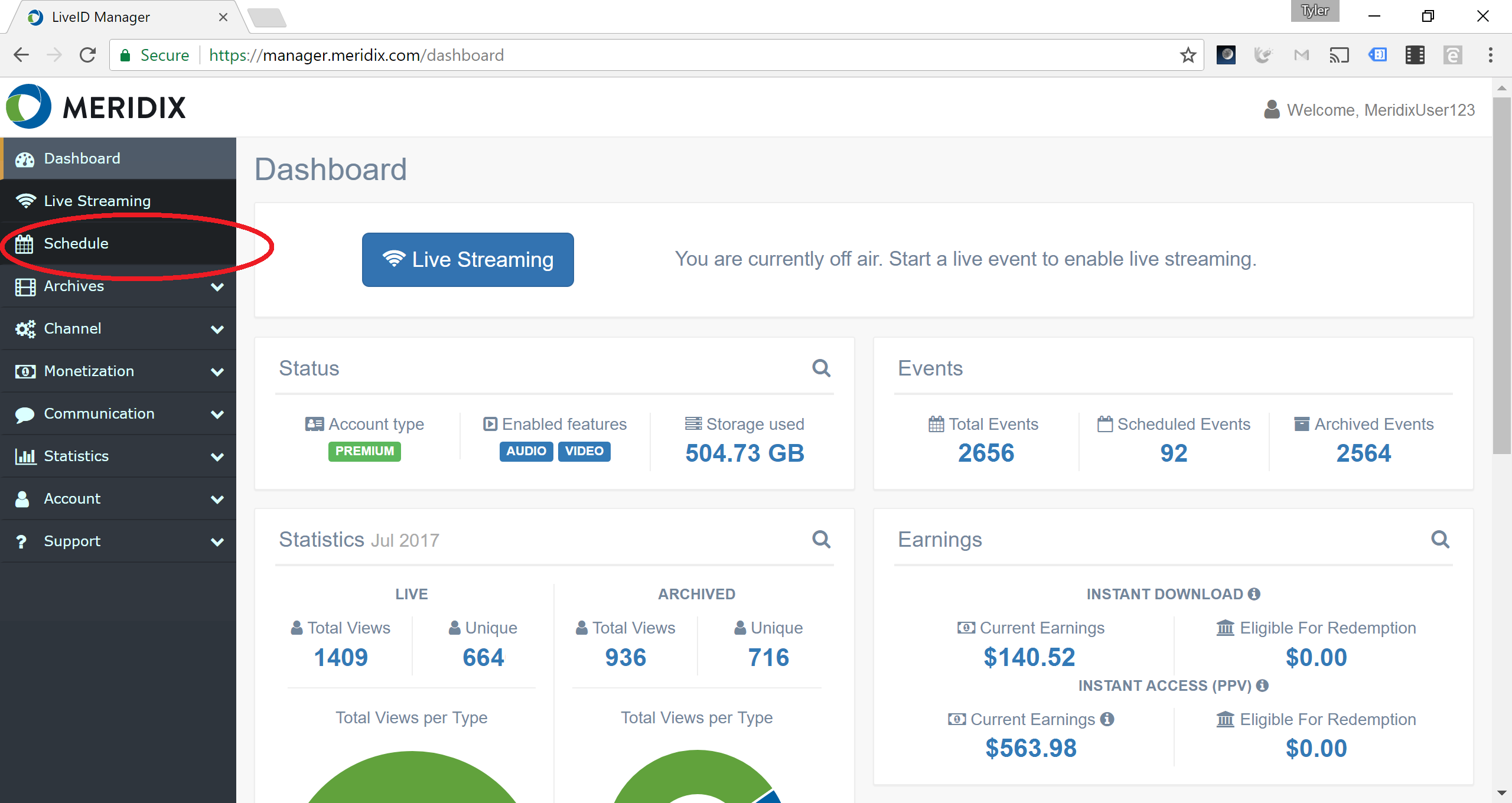 8. If any events are scheduled to go live on your channel within 60 minutes or less, the dashboard will display a countdown timer indicating the amount of time until the system automatically takes the next event live.