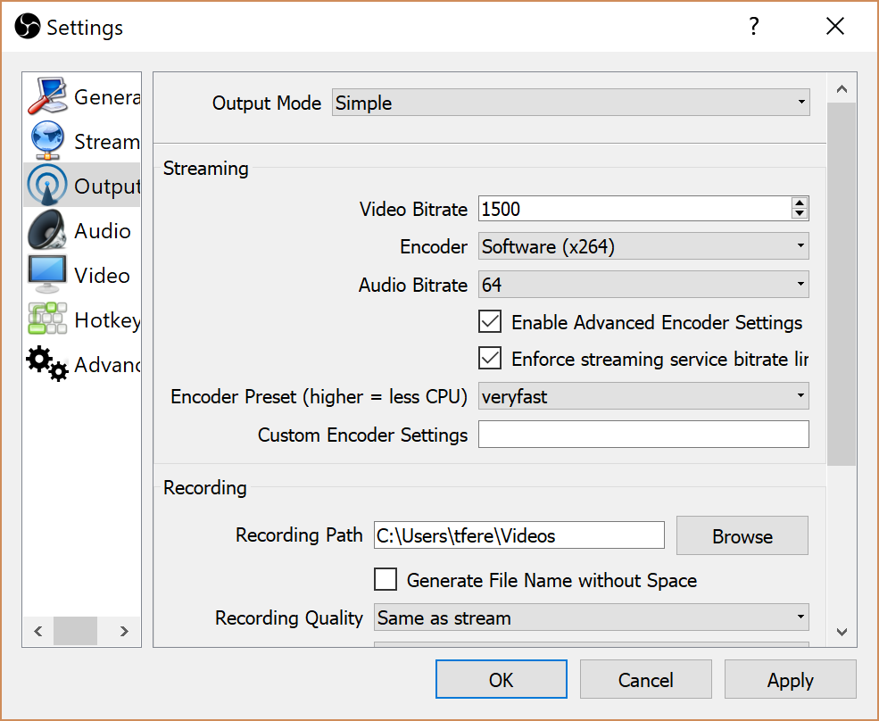 6. Set your video bitrate to 1500 and audio bitrate to 64 as a good starting point, however you can modify these as needed.