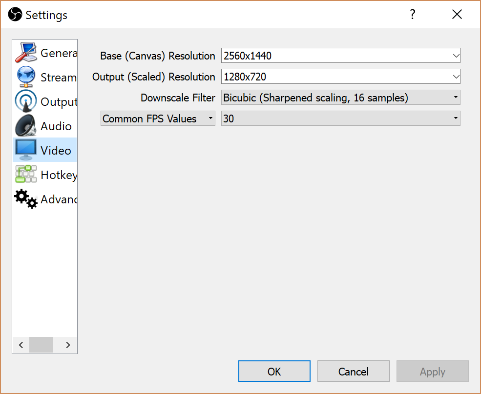 10. Set your Output (Scaled) Resolution to "1280x720" and Common FPS Values to "30".